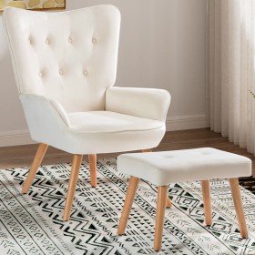 1 x Πολυθρόνα με Σκαμπό Σαλονιού σε Βελούδο Μπεζ Καρέκλα με Υποπόδιο Μοντέρνα